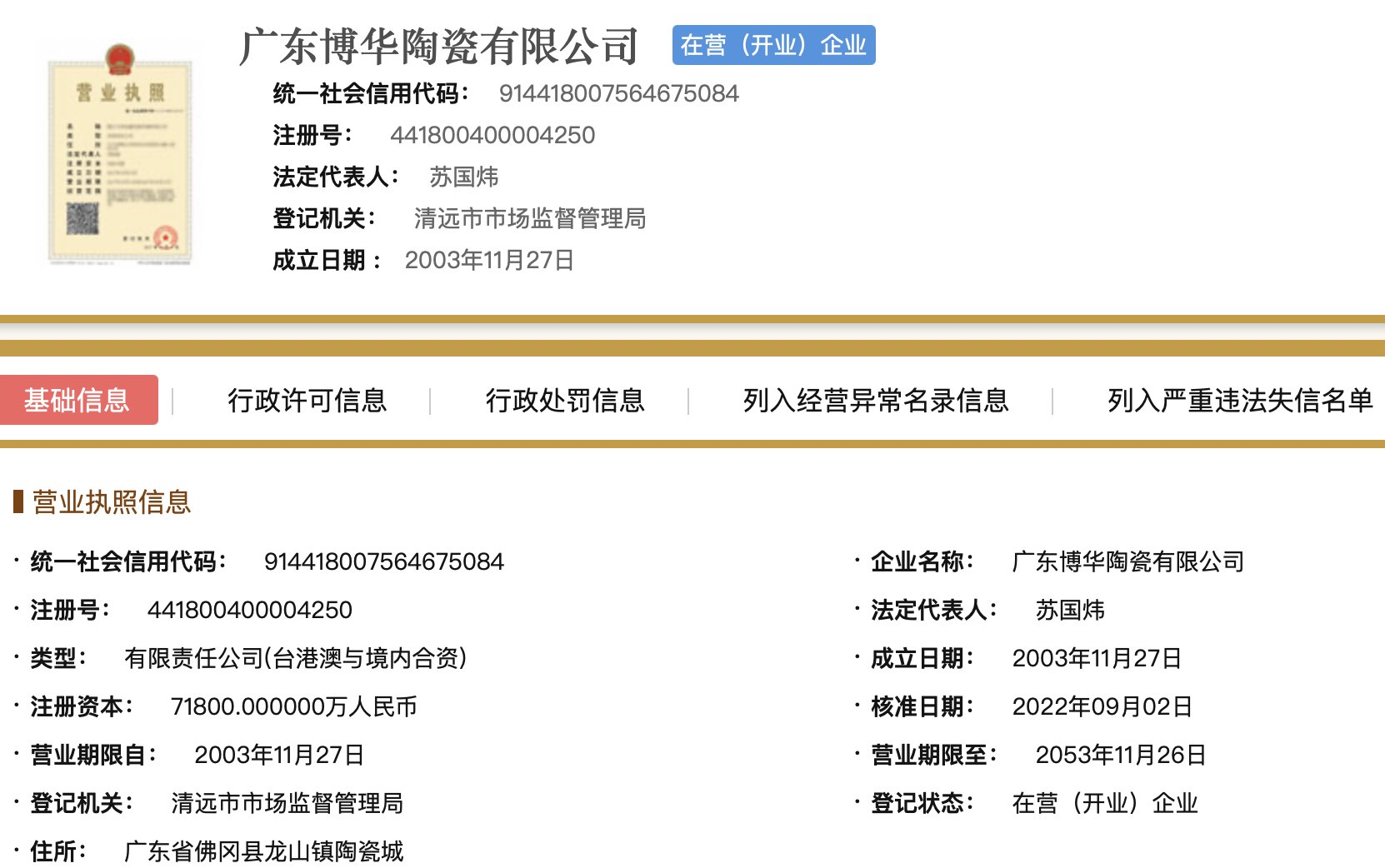 ??乐居财经 吴文婷?9月5日,广东博华陶瓷有限公司(以下简称“博华陶瓷”)法人代表发生变更,由莫永良变更为苏国炜。